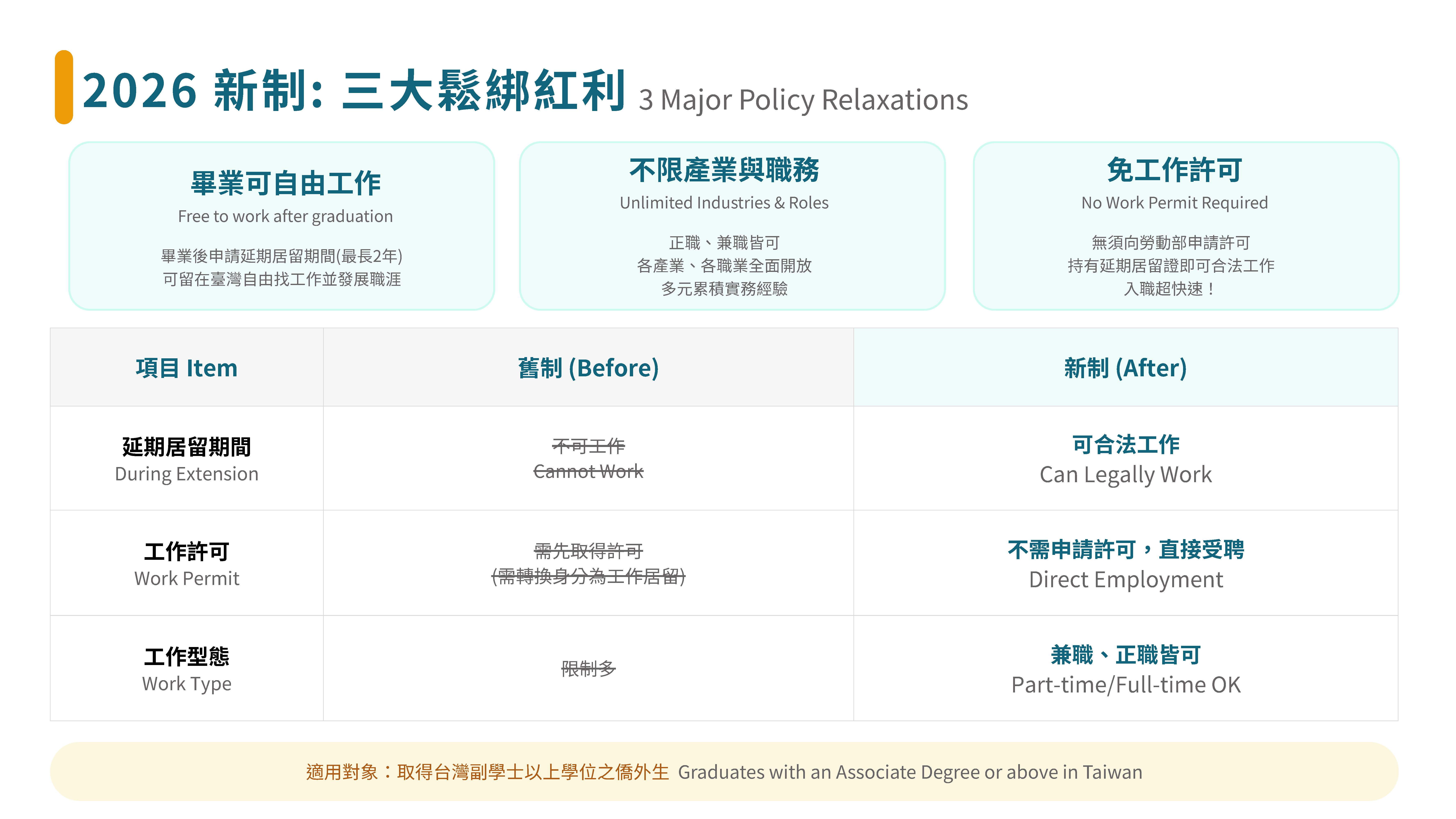 依據最新《外國專業人才延攬及僱用法》修正案,取得台灣副學士(專科)以上學位之僑外生,享有史無前例的三大紅利:According to the latest amendment to the Act for the Recruitment and Employment of Foreign Professionals, international students who obtain an Associate degree or higher in Taiwan now enjoy three unprecedented benefits: