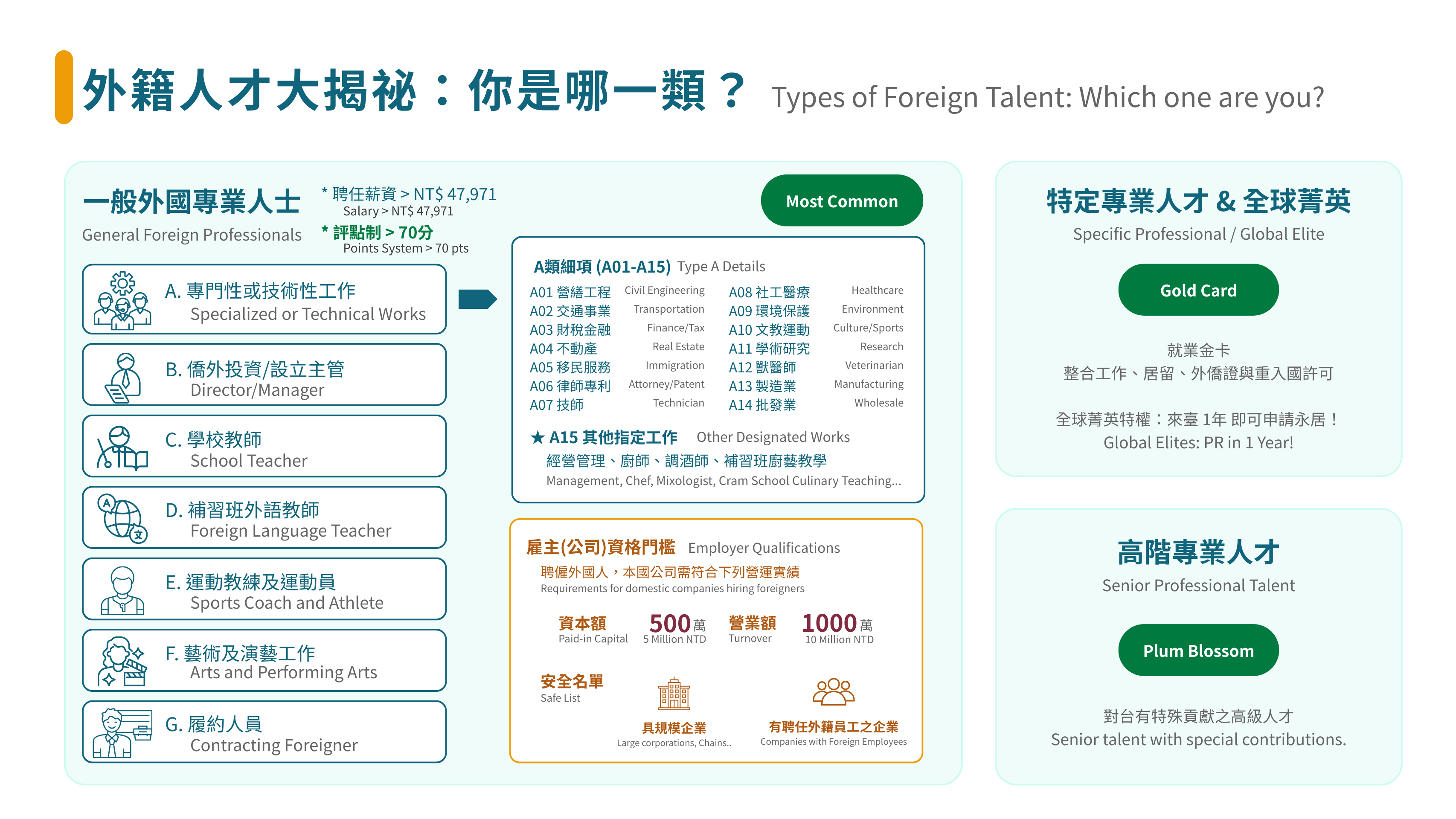 ⚠️ 重要:確認雇主聘僱資格 (Important: Check Employer Eligibility) 不是所有公司都能聘請外國人!求職時請務必確認公司符合以下規模: Not every company can legally hire foreign professionals! Before you commit, please verify that your prospective employer meets one of the following criteria: