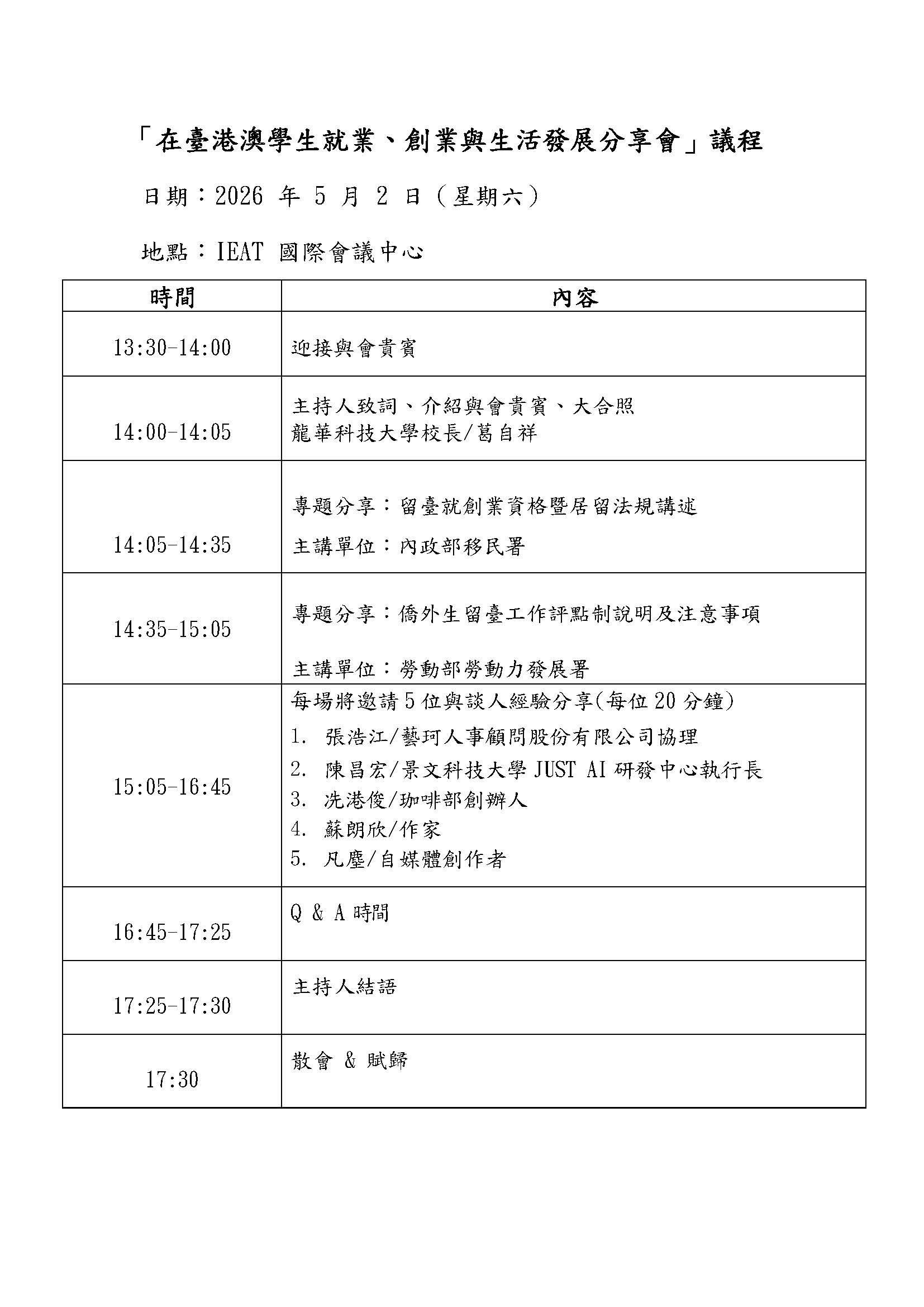 (一)日期、時間:115年5月2日(星期六),14:00-17:30(13:30開放入場)。