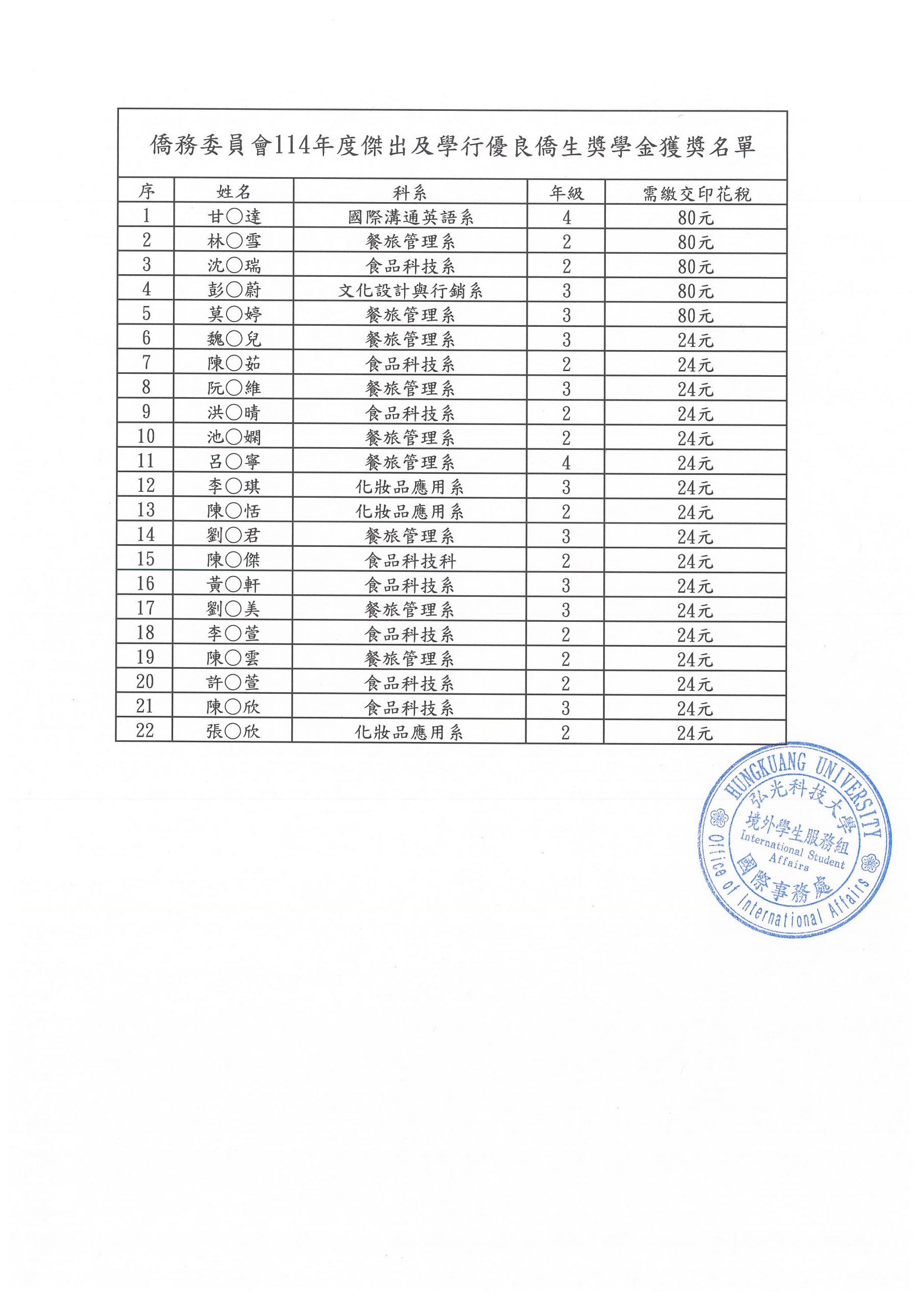 公告-僑委會114年度傑出及學行優良僑生獎學金獲獎名單
