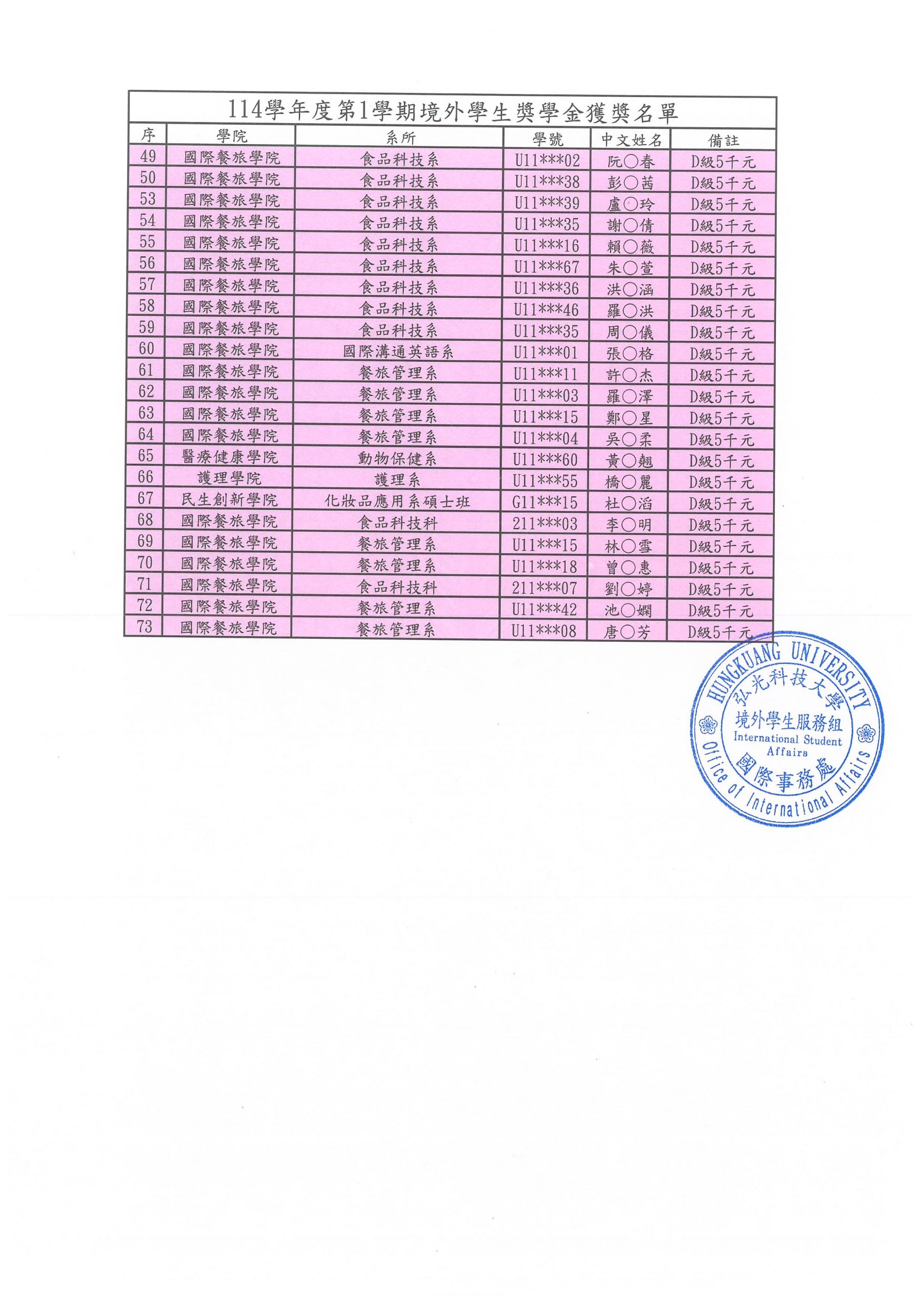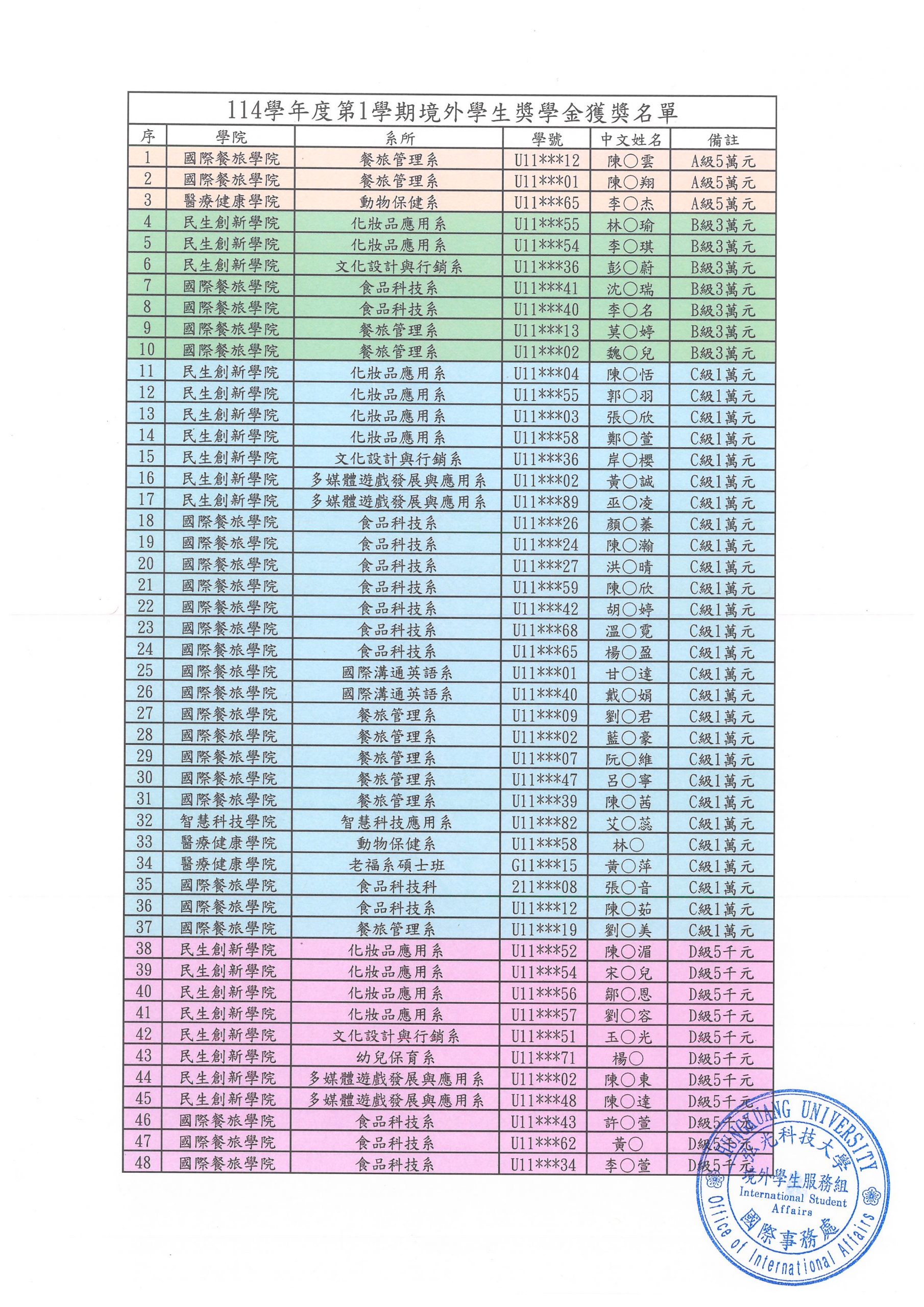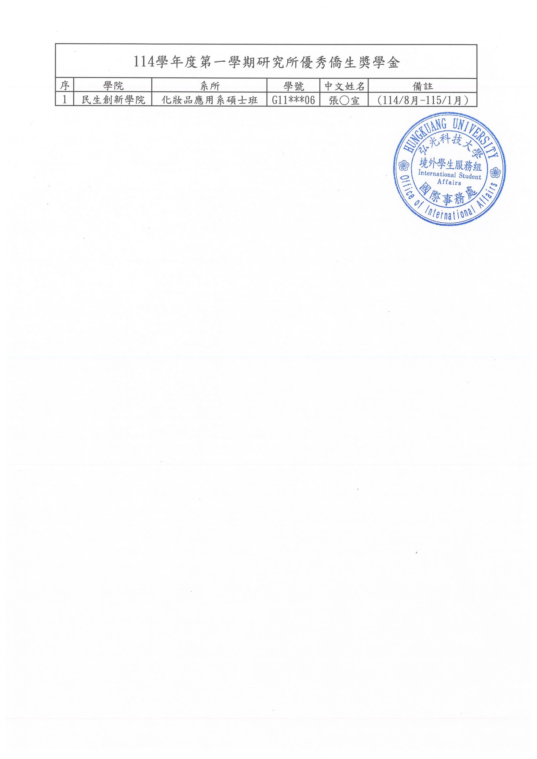 公告-114學年第一學期境外生獎學金及研究所優秀僑生獎學金核發名單