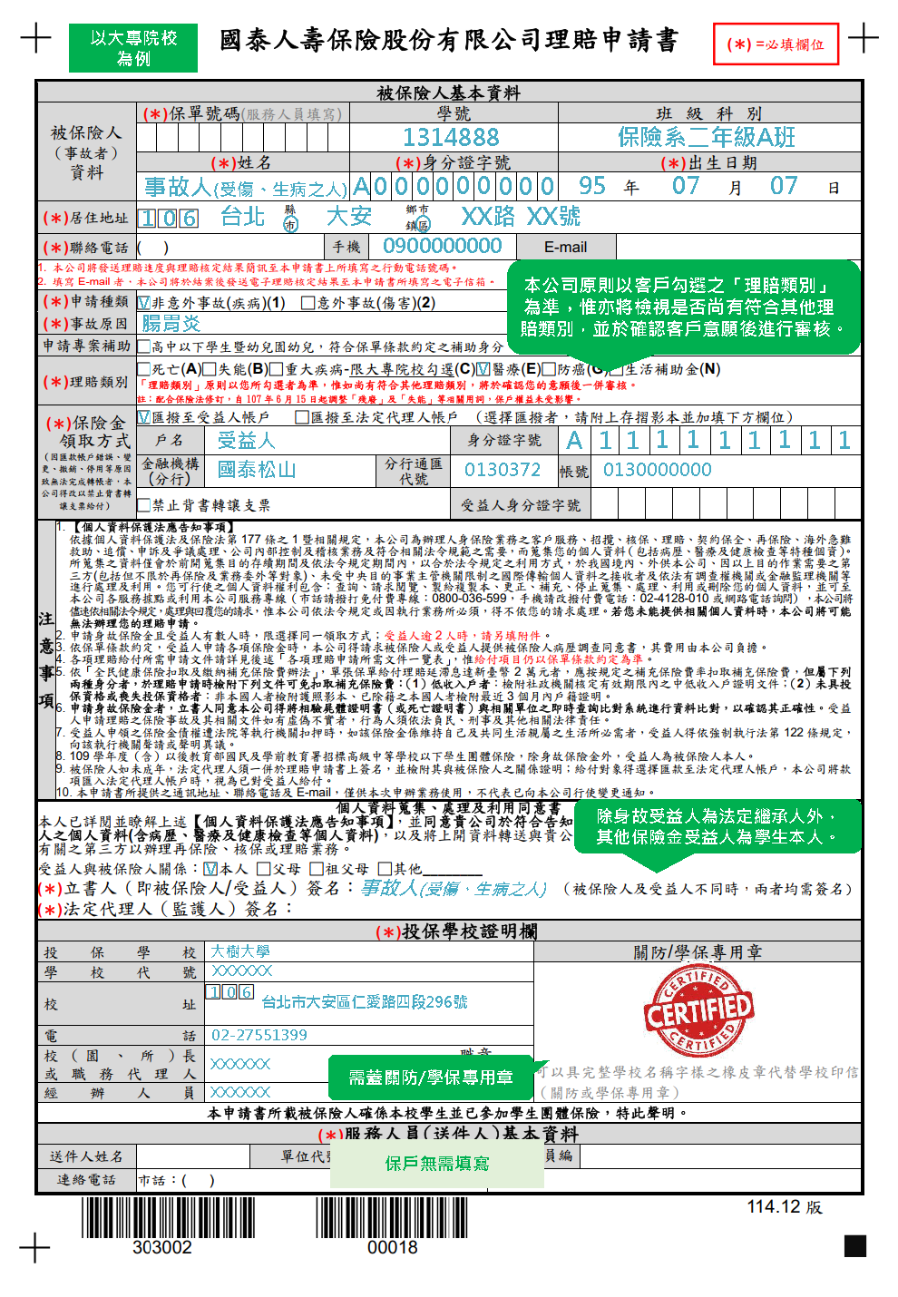 | 3 申請理賠 Submit Claim | 準備好上述文件 + ARC影本 + 存摺影本,至 國際事務處 (L104辦公室) 填寫理賠申請書。 <點此查看–理賠申請書填寫範例> |