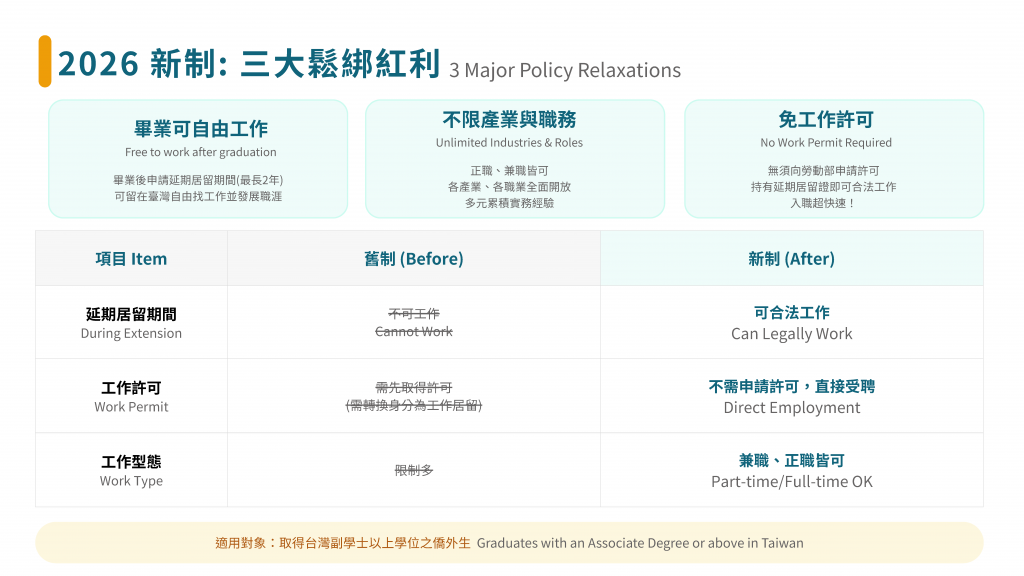According to the latest amendment to the Act for the Recruitment and Employment of Foreign Professionals, international students who obtain an Associate degree or higher in Taiwan now enjoy three unprecedented benefits: